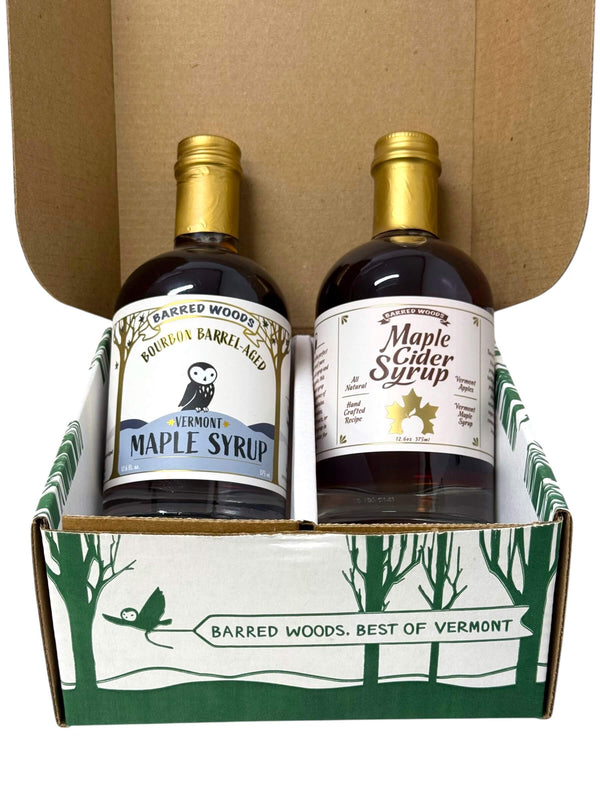 One 375ml bottle of our bourbon barrel aged maple syrup and one 375 bottle of our unique maple cider syrup. Buy together and save. Great for your own and comes in a custom box suitable for gifting.
