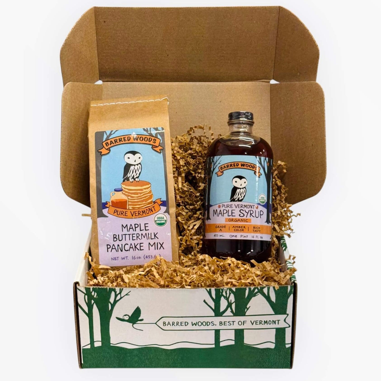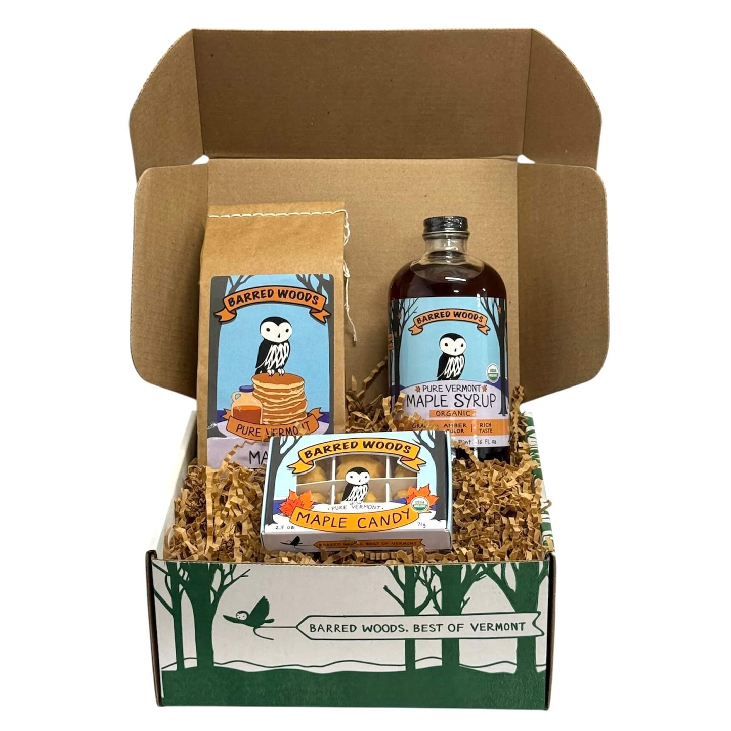 Gift Box of Barred Woods maple syrup products including pure Vermont maple syrup, maple candy, and maple cream on a white background.